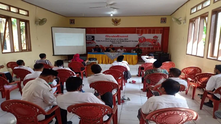 SERANG (STC) - Jelang perhelatan Pilkada Kabupaten Serang tahun 2020, jajaran Polsek Waringinkurung Polres Serang Kota melalui Kanit Provos Bripka Yogi As menghadiri sosialisasi PKPU nomor 6 tahun 2020 tetang pelaksanaan Pilkada, di aula Kecamatan Waringinkurung, Rabu (22/7/2020).